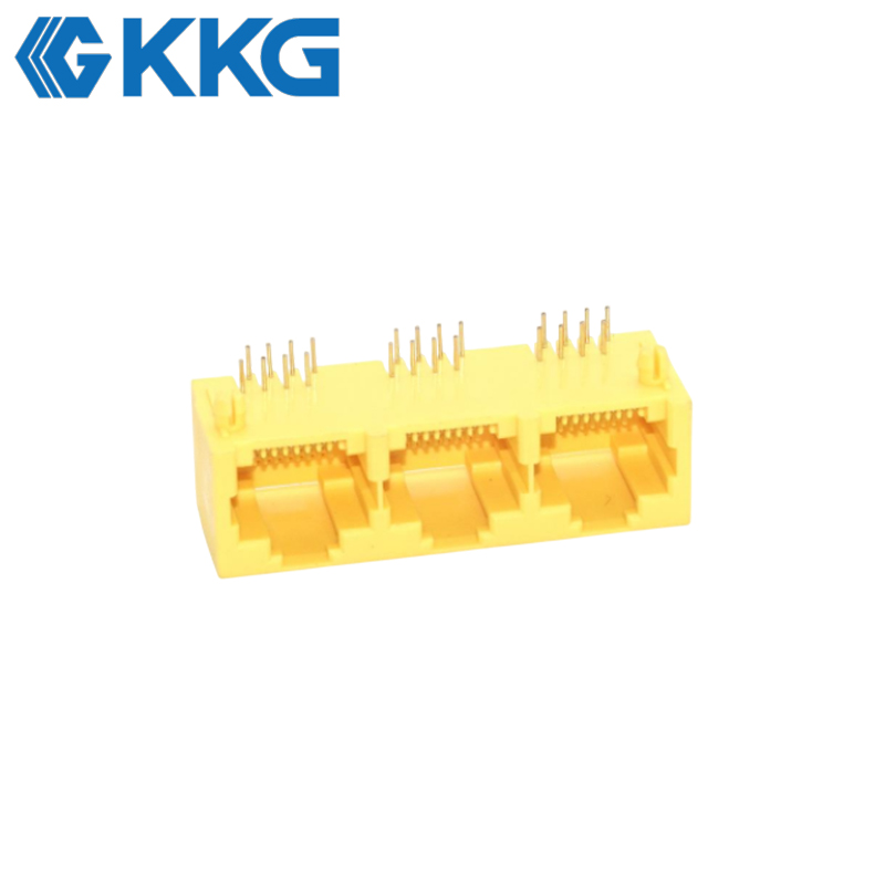Ganged Integration: The thermoplastic housing molds three distinct jack cavities into a linear block allowing three independent Ethernet cables to connect to the PCB sharing a common structural alignment.